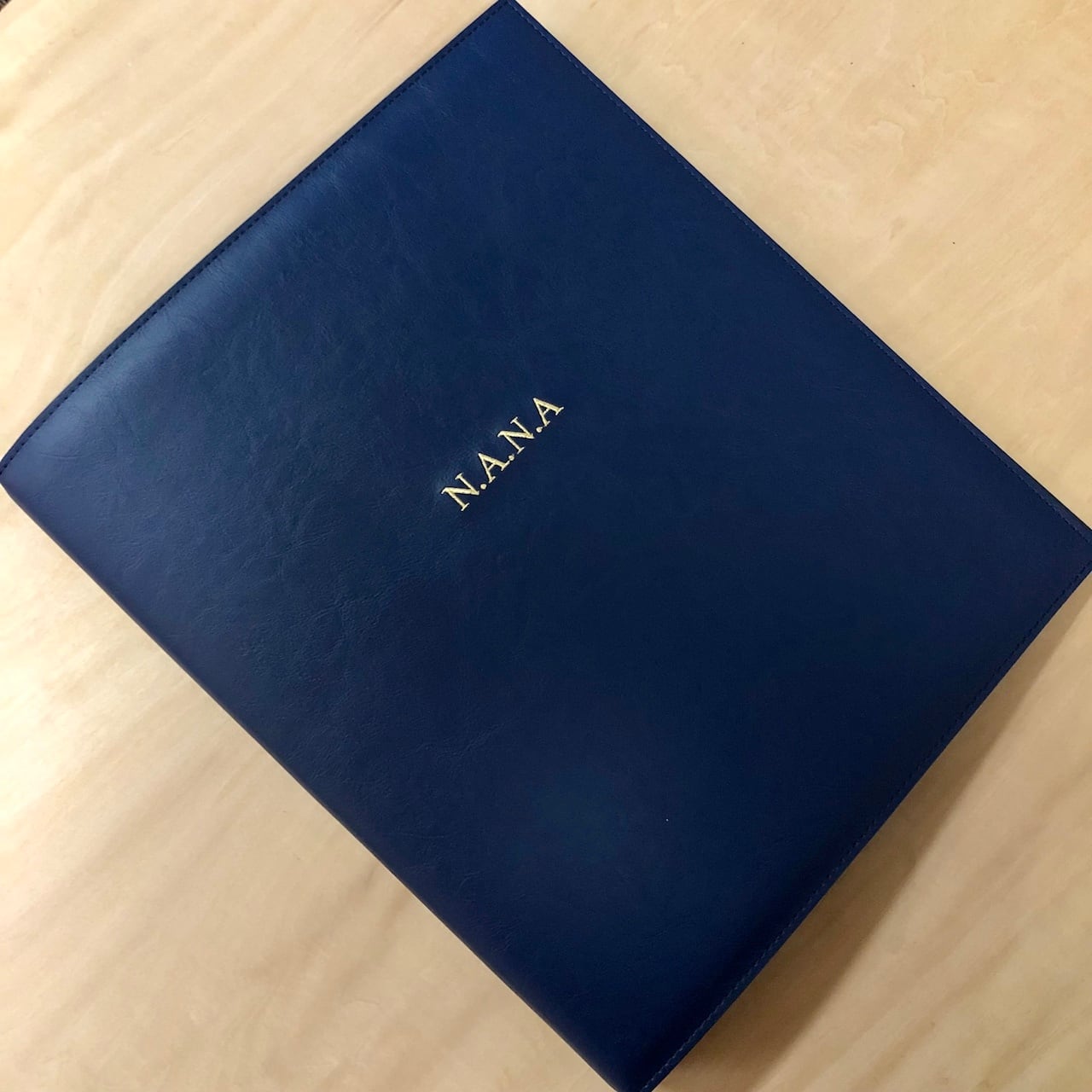 名入れは箔押しと刺繍の2種類。サイズや色、配置も自由に選べます。世界にひとつだけのオリジナルファイルとして、作品をより引き立てます。